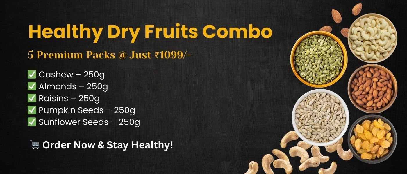 Boost your health with 5 nutrient-rich packs – Cashews, Almonds, Raisins, Pumpkin Seeds & Sunflower Seeds.